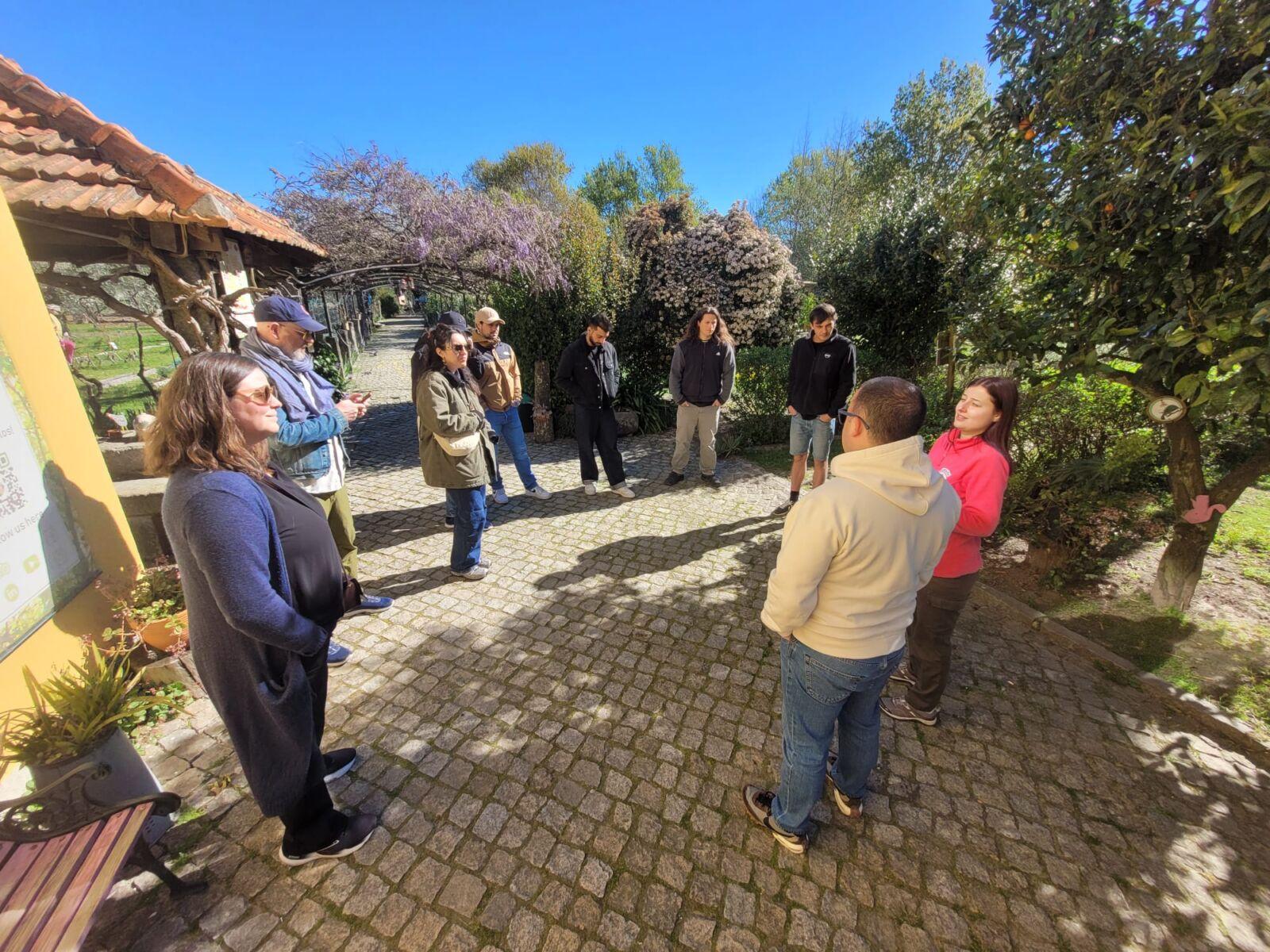 Prvi dan delovnega srečanja je bil namenjen spoznavanju dobrih praks v lokalnem okolju. Poudarek je bil na trajnostnih projektih, ekološkem turizmu in kmetijstvu ter dejavnostim, ki jih že vodijo mlajše generacije. Prvi postanek je bil na Casa das Palmeiras nedaleč stran od mesteca Viseu, kjer nas je mlada prevzemnica kmetijske dejavnosti popeljala po družinskem posestvu, ki se je v zadnjih letih iz agrarnega transformiralo v turistično. Na posesti ponujajo prenočitvene zmogljivosti s poudarkom na učni in doživljajski izkušnji kmetije, namenjeni ravno mlajšim generacijam. Pot smo nadaljevali v še bolj ruralno okolje, kjer smo spoznali dva primera oživljanja zapuščenih vaških skupnosti. V enem primeru je šlo za prenovo celotne podeželske vasice v razloženi hotel, a je investicija žal obtičala in vasica trenutno ne živi, v drugem primeru pa je šlo za zasedbo zapuščene vasi s strani ekološke skupnosti prebivalcev bližnjih mest, ki so vzpostavili eko-komuno, ki živi po principu permakulture. Posebnost te skupnosti je, da se vasica nahaja na enem kraku portugalske poti Camino in kot taka povsem brezplačno nudi zavetje in prenočišče mimoidočim mladim popotnikom. Dan smo zaključili z obiskom vinogradniške posesti, kjer so družinsko dejavnost prav tako prevzele mlajše generacije, se povezale v večji konglomerat in sedaj uspešno vodijo zgodbo pridelave ekoloških vin, ki jo nadgrajujejo z regijsko kulinariko.